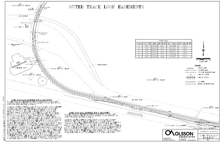 Beginning at the Southeast corner of said Lot Two (2); thence on an assumed bearing of N00°42'45"E upon and along the East line of said Lot Two (2) a distance of 136.30 feet to a point on the Southerly line of Lot Two (2), a distance of 136.30 feet to a point on Southerly line of Lot Nine (9), Aurora West Subdivision Replat; thence S76°00'54"E upon and along said Southerly line of Lot Nine (9) a distance of 203.98 feet to a point on the East line of said Lot Nine (9), thence N02°41'46"E upon and along said East line of Lot Nine (9), a distance of 335.91 feet; thence N27°00'20"E upon and along said Easterly line of Lot Nine (9) a distance of 322.63 feet, thence N89°24'13"E a distance of 101.14 feet, thence N01°00'56"E upon and along said East line of Lot Nine (9) a distance of 228.95 feet to a point on the South line of Lot Two (2), Aurora Business Park South 4th Subdivision; thence S89°11'45"E upon and along the South lines of said Lot Two (2) and Lot One (1), Aurora Business Park South 4th Subdivision, a distance of 746.18 feet to the West Right-of-Way (ROW) line of 0 Road, thence S00°48'38"W upon and along said West ROW Line a distance of 1200.06 feet to the intersection of said West ROW line and the Northerly ROW line of the Burlington Northern Railroad, thence N77°15'37"W upon and along said Northerly ROW line of the Burlington Northern Railroad, a distance of 1226.44 feet to the point of beginning.