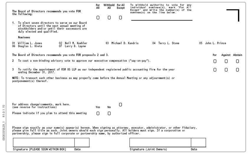 At this year’s Annual Meeting, stockholders will be asked to (i) elect seven directors; (ii) cast an advisory vote to approve our executive compensation; and (iii) ratify the appointment of RSM US LLP to serve as our independent registered public accounting firm for the year ending December 31, 2017.